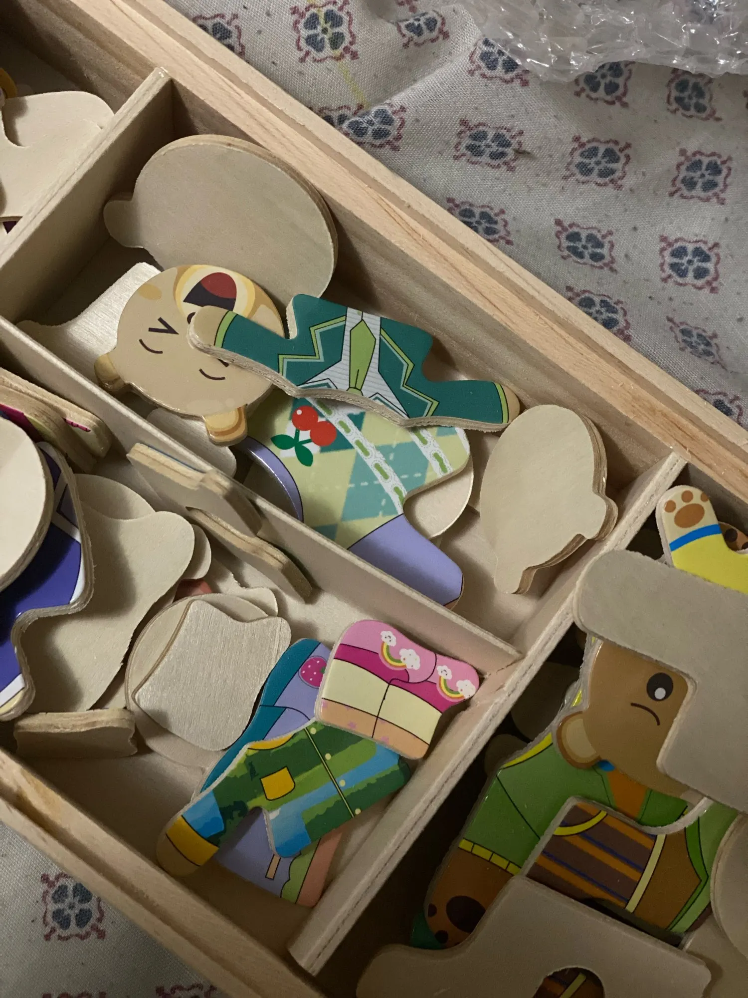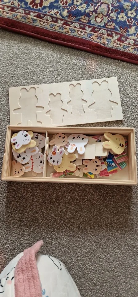 The wooden pieces are chunky and satisfying to handle which makes it accessible for little hands that are still developing their grip and coordination. For children who are working on self care skills like learning to dress themselves this kind of play based practice translates directly into real life in a gentle low pressure way.