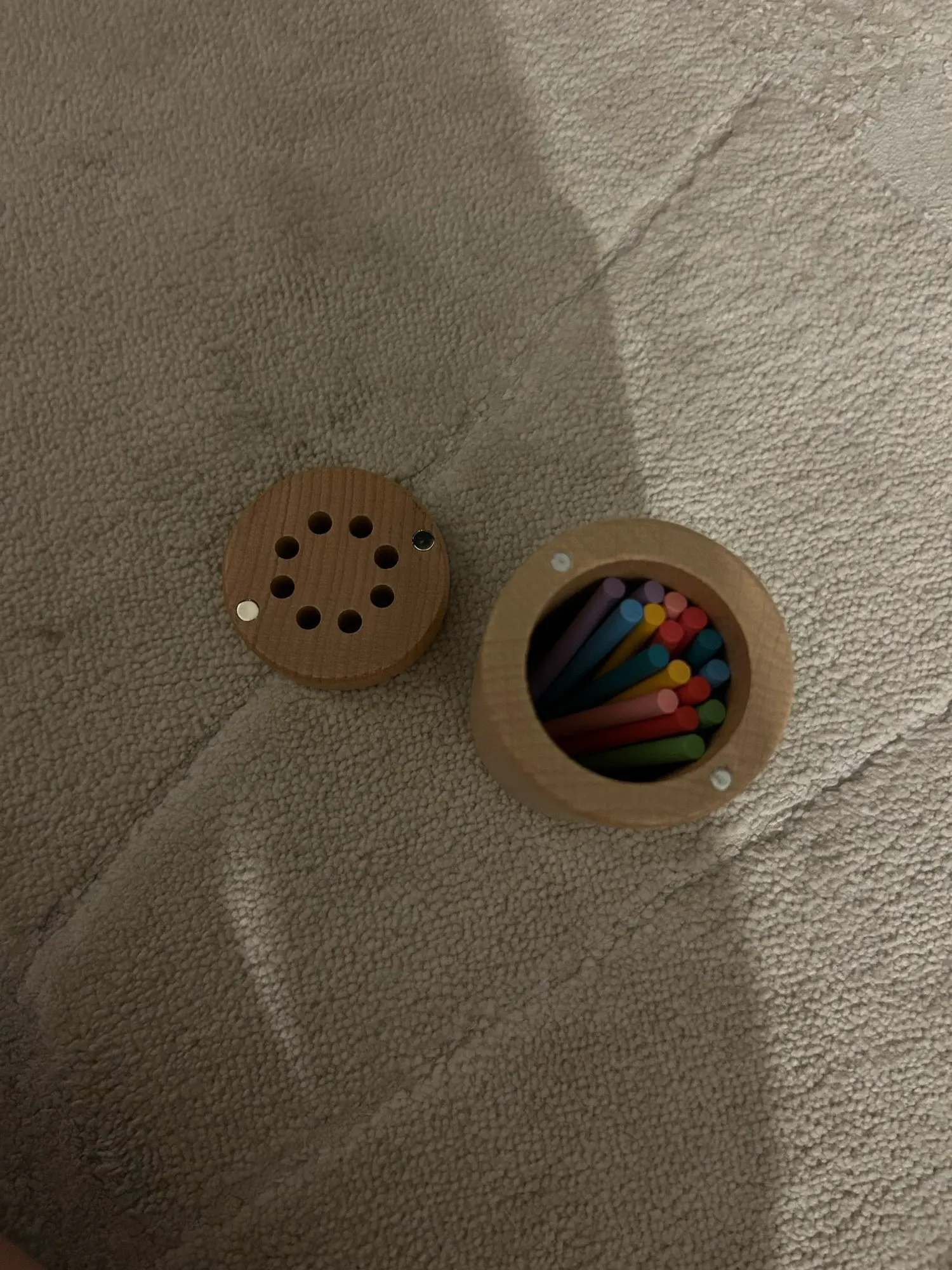 Shawanda Fay Really high quality wood, opens easily, high quality colors, comes with 2 sticks of each color, just for ointment. I bought for my one year and seven month old baby, it's very nice
